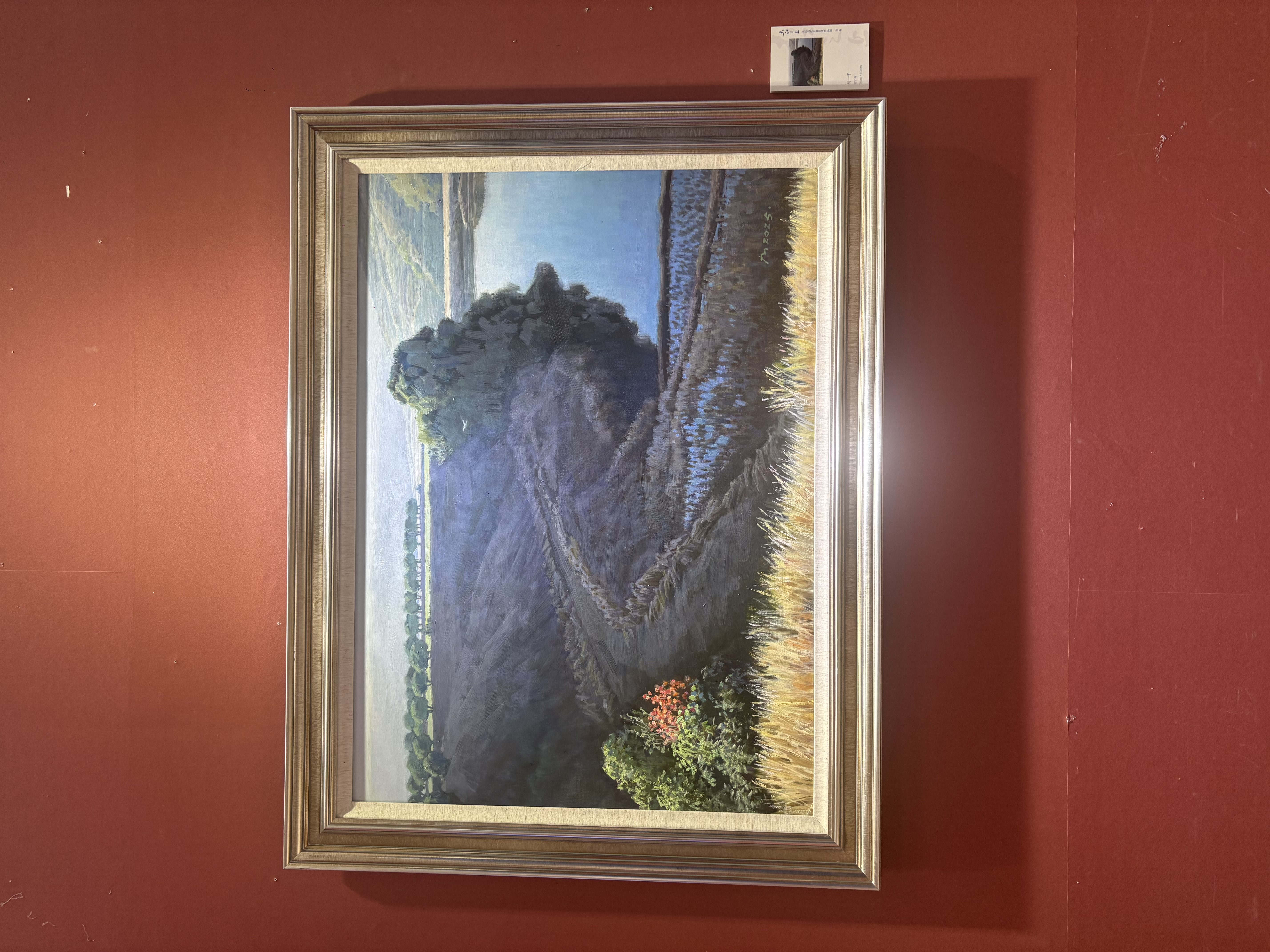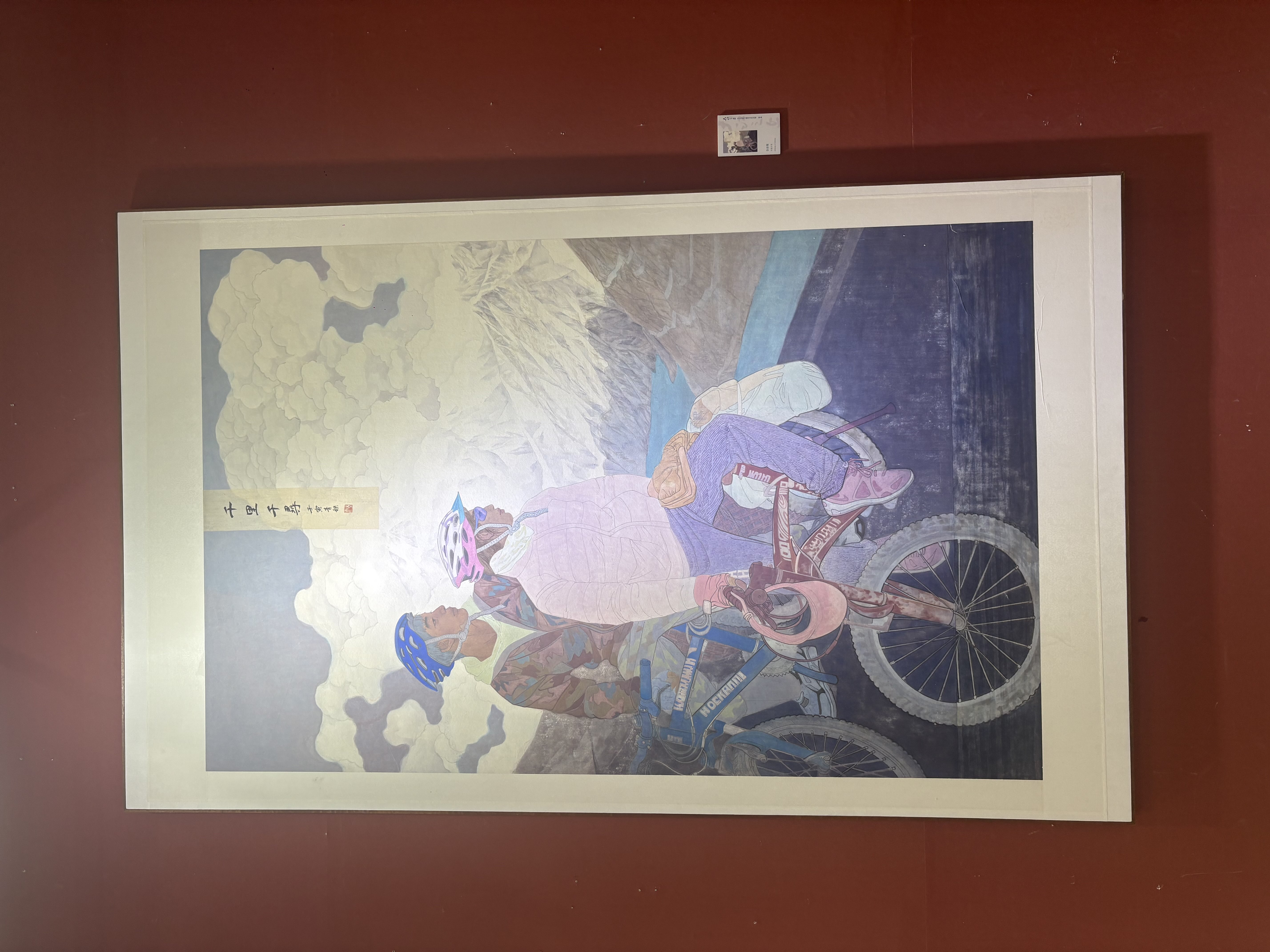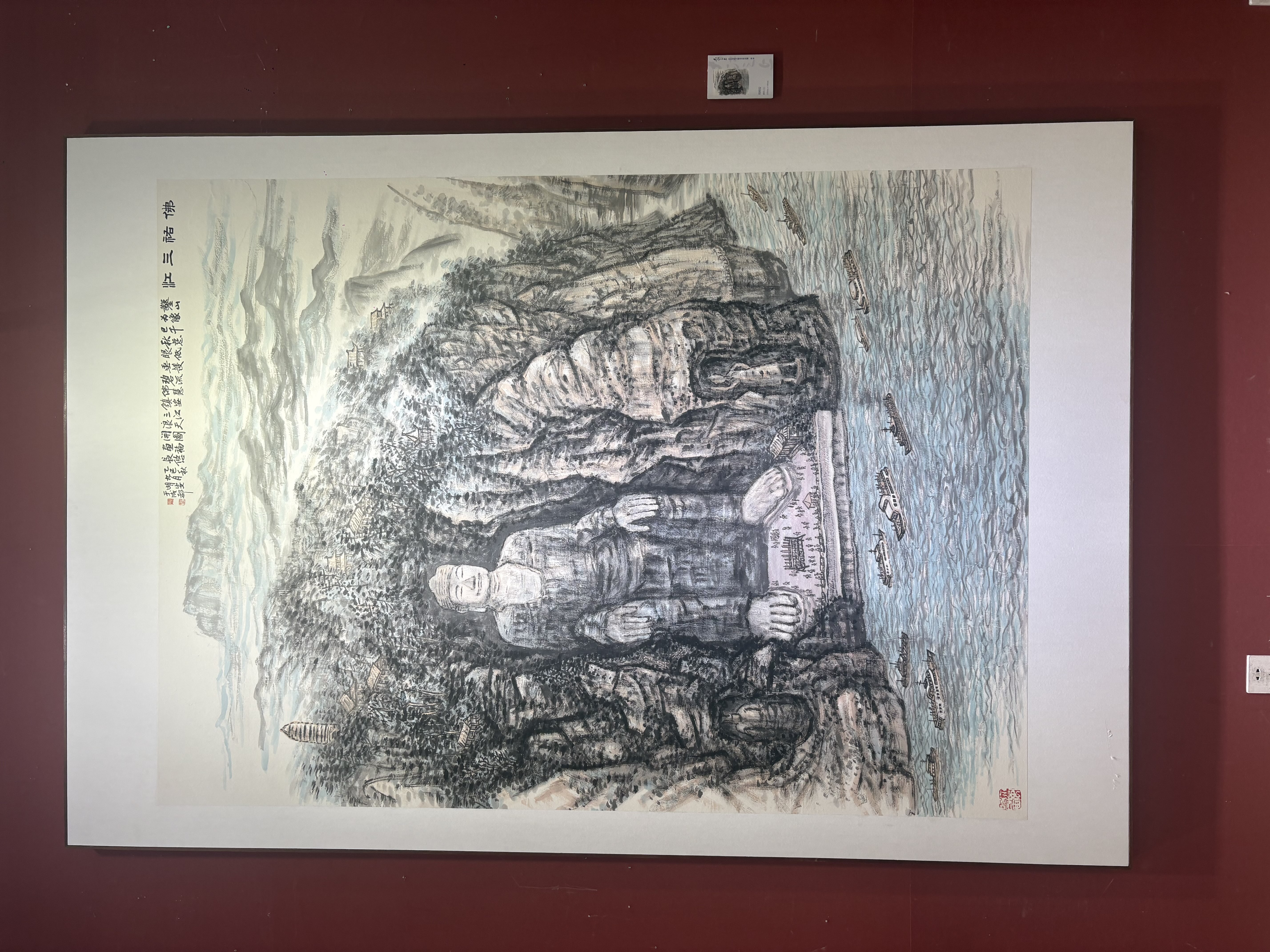 记者在现场发现了不少名家作品。比如李青稞的《千里千寻》,描绘的是两位骑行者回望长江的身影,意境悠远;周明安的《佛佑三江》将乐山大佛的庄严与三江汇流的浩荡融为一体,充满人文底蕴;龚仁军的《塘边人家》则捕捉长江沿岸朴素的生活场景,烟火气息扑面而来。马一平的油画《密宁湾》展示出江水蜿蜒的静谧一刻,庞茂琨的油画《涓涓细流》捕捉山崖飞瀑的灵动瞬间。陈志才的水墨作品《生态长江》,水中的游鱼仿佛可以直接触摸,呼应了生态保护的主题;姚叶红的《蜀道》与李晖的《江源叠翠》皆以传统山水笔意,再现蜀山层峦叠翠、江水穿行其间的壮美古意。
